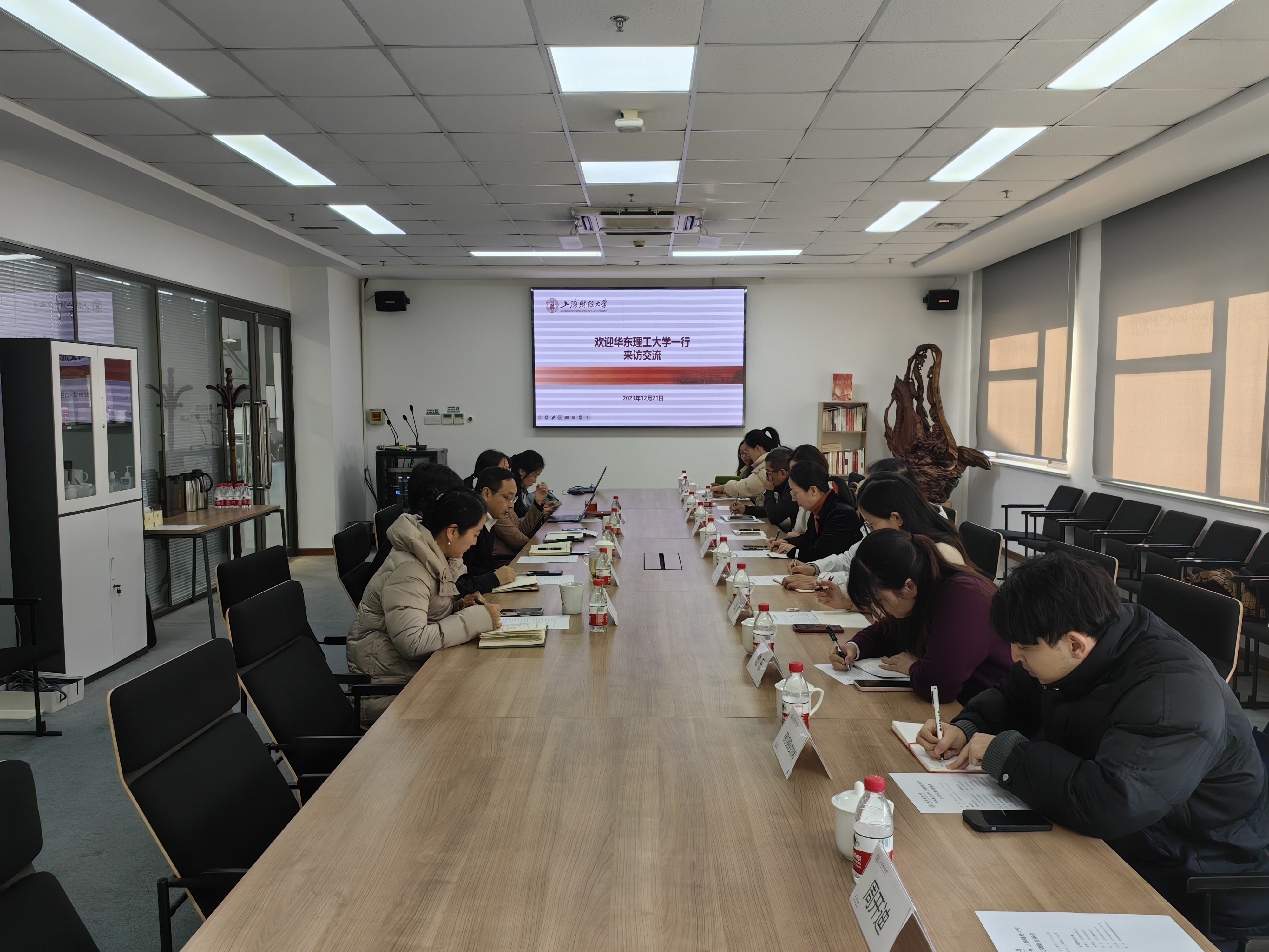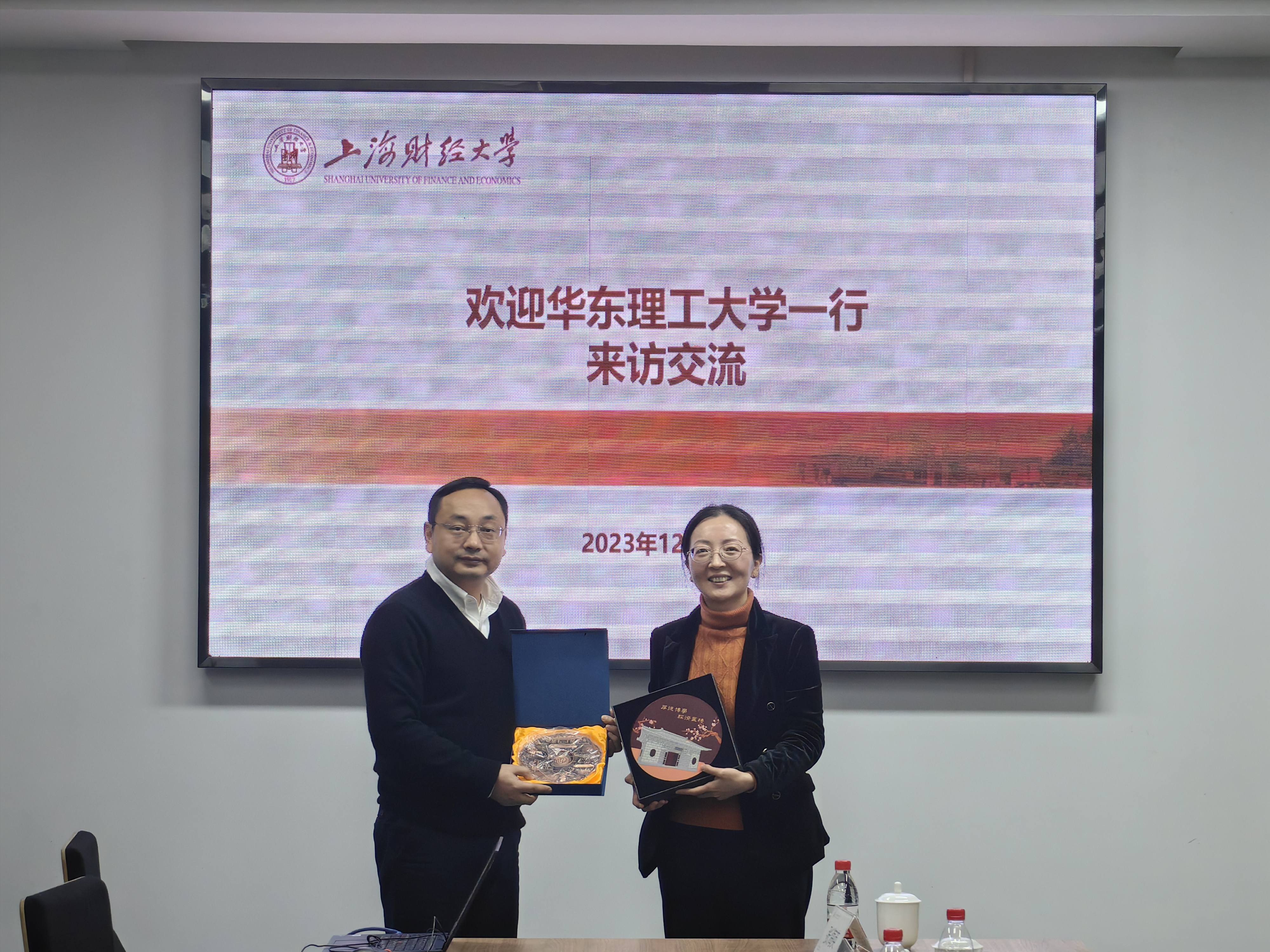 会后,两校互赠纪念品,王芝眉向上财老师们介绍了牛犇犇与华理校友情感的深厚渊源,并表示华理与上财情谊深厚,一直有着密切交流,未来也欢迎上财的同仁们来校分享交流。