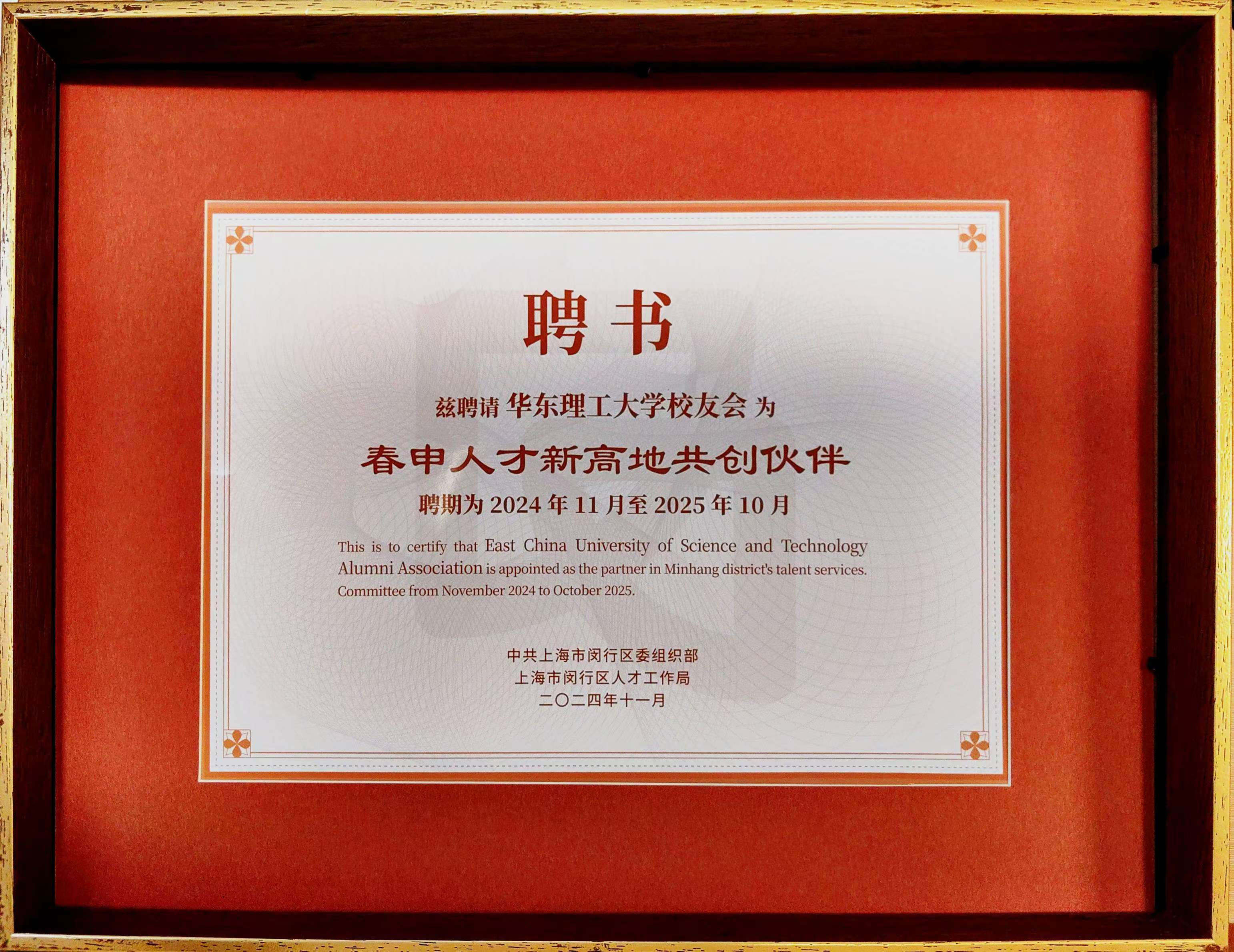 区委常委、宣传部部长曹婕为共创伙伴颁发聘书,我校校友会受聘成为“春申人才新高地”高校共创伙伴之一。这不仅象征着华理与闵行区的进一步深度合作,也彰显了华理在人才培养、学科建设领域的深厚底蕴与卓越贡献,未来更将依托其丰富的人才资源、广泛的校友网络和鲜明的行业优势,携手推进创新链、产业链、资金链、人才链深度融合,为区域发展注入强劲的智力支持与人才动力,共创更加璀璨的未来篇章。