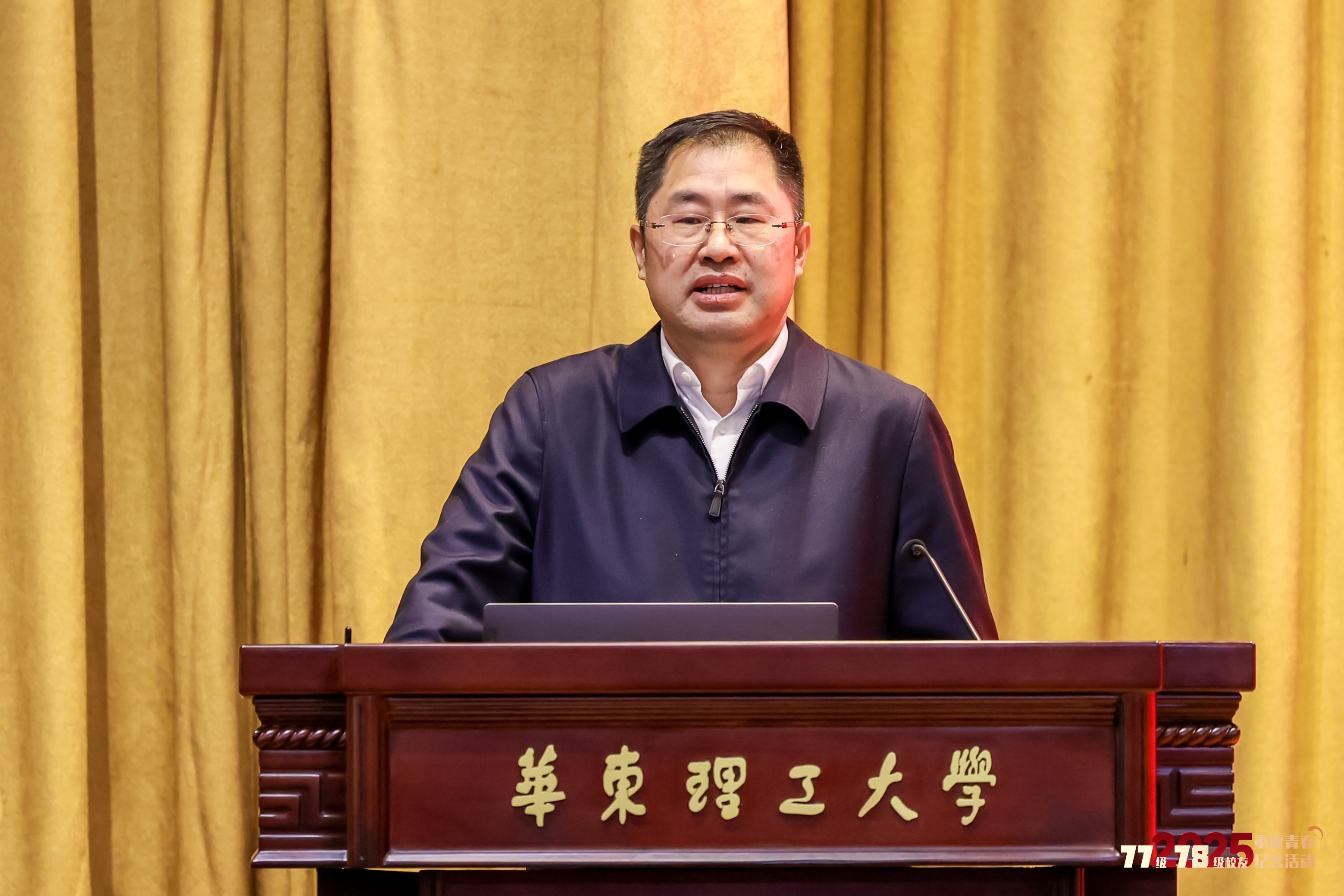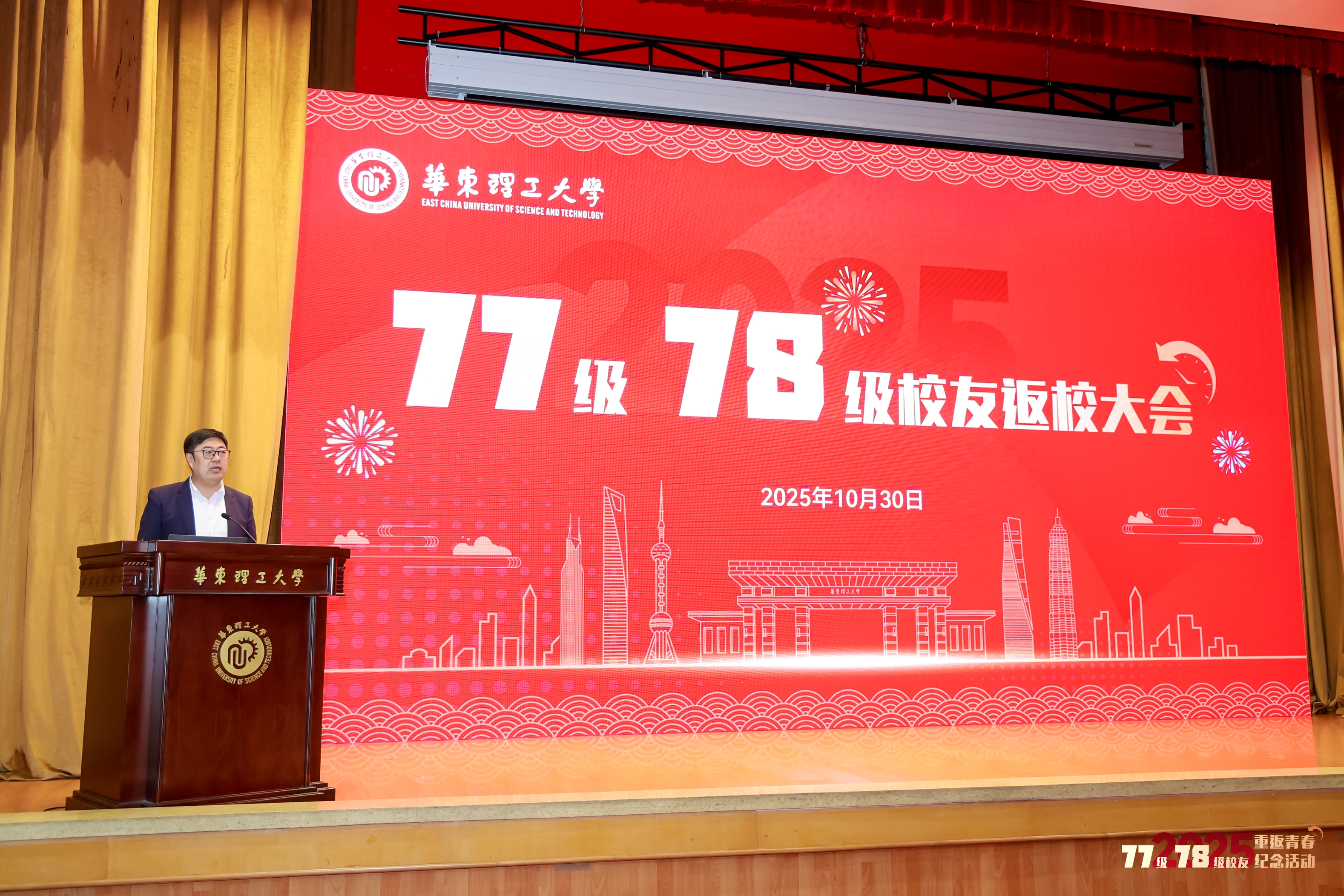 会上,蒋传海首先代表学校对77、78级校友表示诚挚欢迎。他指出,与会校友们肩负时代使命,秉持“勤奋求实、励志明德”的校训精神,将个人命运与祖国发展紧密相连,在各自岗位上建功立业,为国家建设作出了重要贡献,同时为母校赢得了广泛声誉。在一代代华理人的接续奋斗下,近年来,学校深入贯彻落实二十届三中全会和全国教育大会精神,在人才培养、科学研究、社会服务等方面取得了新进展新成效。面对新形势新任务新要求,期待广大校友继续为母校发展建言献策、汇聚资源,共同铸就多学科协同发展、特色鲜明的世界一流大学建设新荣光,为教育强国建设和推进中国式现代化贡献华理人的智慧力量!