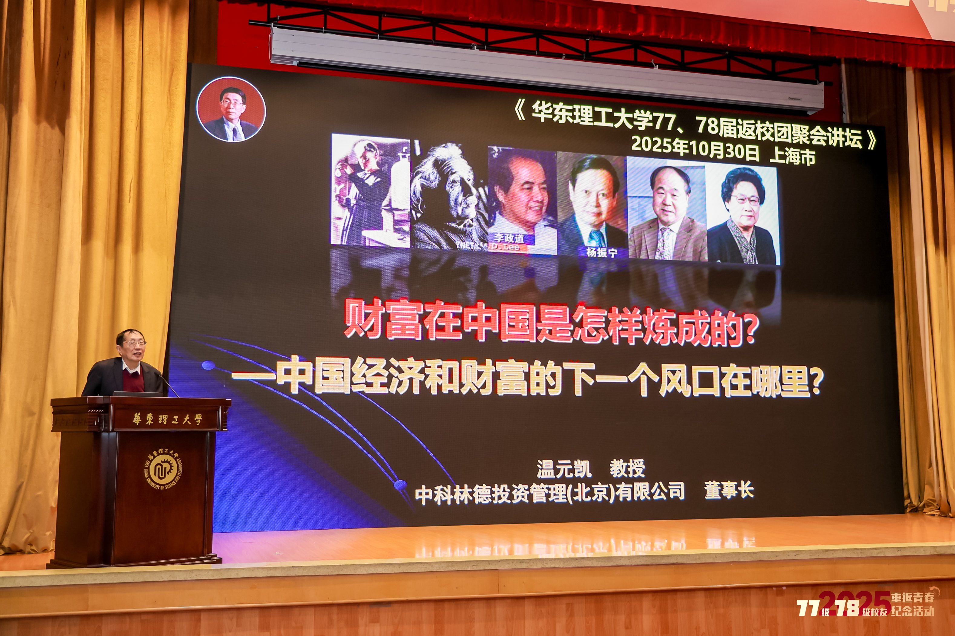 大会特别邀请中国著名经济学家温元凯教授作分享。作为1977年邓小平同志主持的科学和教育工作座谈会参与者,温元凯教授在八十年代,曾多次来华理为师生做报告。此次他以《中国经济和财富的下一个风口在哪里?》为题,解析时代趋势,其宏阔视野与深刻洞察赢得阵阵掌声。